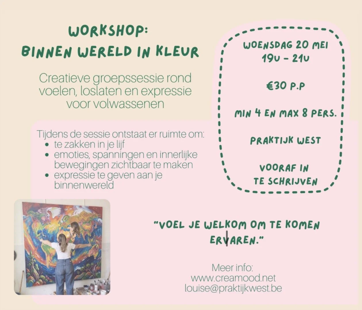Binnenwereld in kleur is een groepssessie creatieve therapie voor volwassenen waarin deelnemers worden uitgenodigd om emoties en innerlijke gewaarwordingen op te merken en deze via beeld, kleur en poëzie op een niet-oordelende manier tot expressie te brengen.